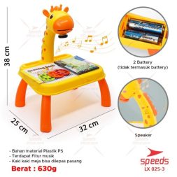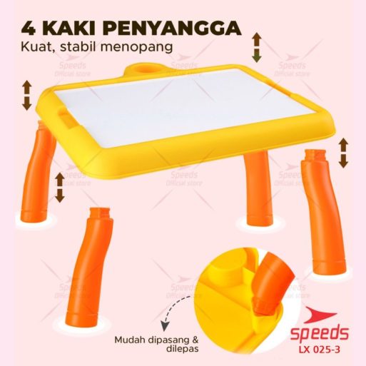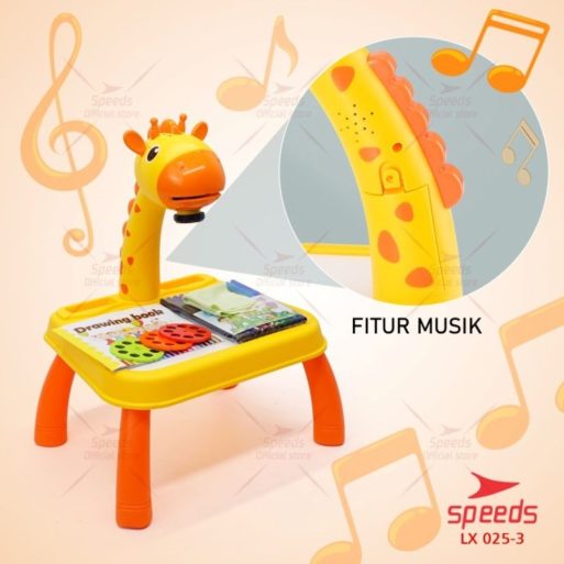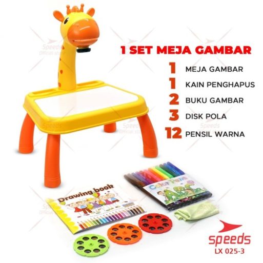 Meja Lukis ini dilengkapi dengan proyektor dan 3 disk dengan berbagai macam pola. Anak bisa mencontoh lukisan yang diproyeksikan ke meja. Awalnya mungkin anak bisa menjiplak hasil dari proyeksi yang ada dimeja, dan dengan seiringnya waktu maka anak bisa belajar menggambar sendiri tanpa harus mencontoh proyeksi gambar yang ada di meja.